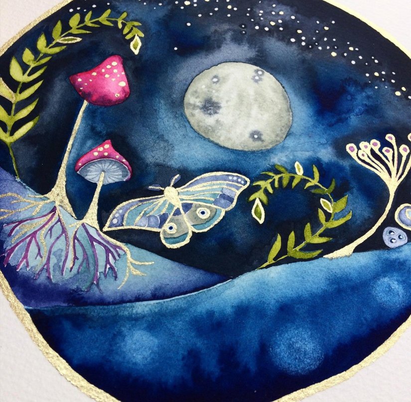 Dawn Shade ( what a name!) is predominantly a water colour artist. I find it hard to describe Dawn’s work and why I am so drawn to it. There’s a definite peace and serenity to it. Slightly ethereal and certainly magical. I asked Dawn how she describes herself, I feel there is a pagan folk lore aspect, but she doesn’t identify with ‘witch’ or strong labels; simply artist. She said: